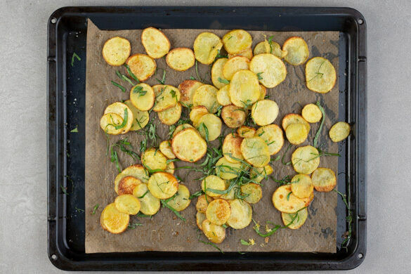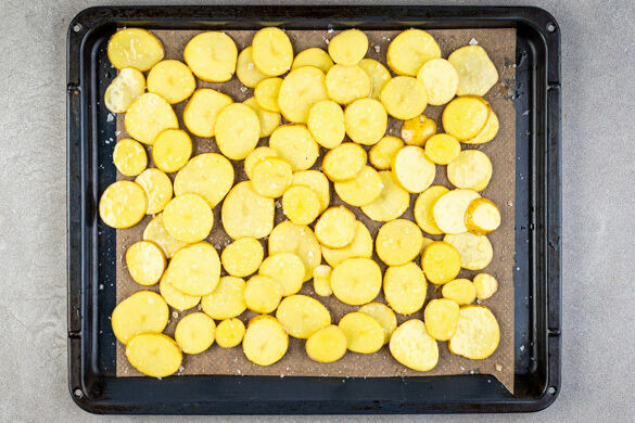 Den Backofen auf 240°C (220°C Umluft) vorheizen. Die Kartoffeln samt Schale in dünne Scheiben schneiden.
