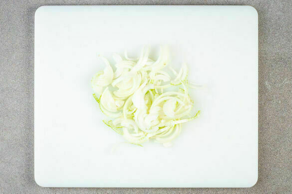 Den Backofen auf 240°C (220°C Umluft) vorheizen. In einem mittelgroßen Topf 600ml leicht gesalzenes Wasser für den Reis zum Kochen bringen. Die Zwiebeln schälen, halbieren und in dünne Streifen schneiden.