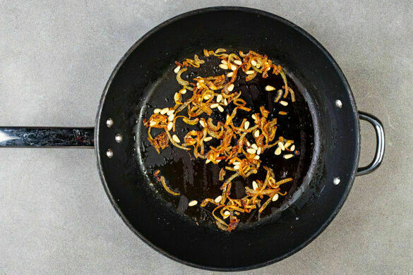In einer großen Pfanne 2EL Butter bei mittlerer bis starker Hitze schmelzen. Die Zwiebeln mit 1TL Salz und ½TL Zucker zugeben und 5–6Min. karamellisieren, dabei gelegentlich umrühren. Die Pinienkerne in der letzten Minute dazugeben und mitrösten, bis sie goldbraun sind. Die Zwiebeln, die Butter und die Pinienkerne aus der Pfanne nehmen und beiseitestellen.