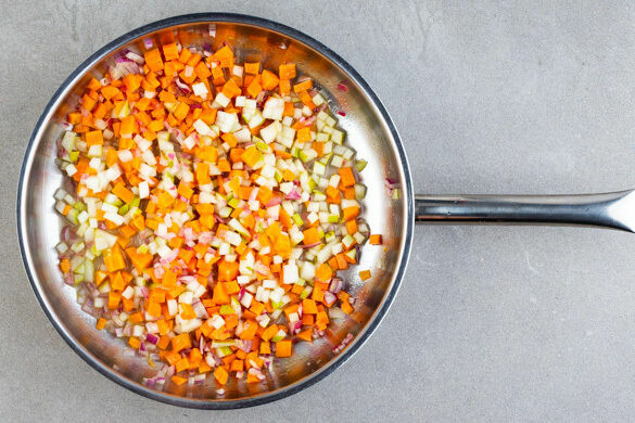 Die Zwiebeln schälen und in feine Würfel schneiden. Die Karotten ggf. schälen und ebenfalls fein würfeln. Die Petersilie samt Stängeln grob schneiden. Die Birnen längs vierteln, entkernen und in ca. 1cm große Würfel schneiden.