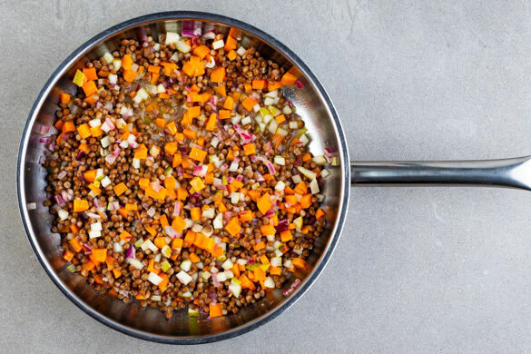 Die Linsen in ein Sieb abgießen, mit kaltem Wasser abspülen, gut abtropfen lassen und zum Gemüse in die Pfanne geben. Kurz unterrühren und die Pfanne vom Herd nehmen.