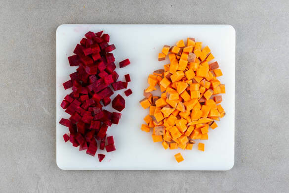 Den Backofen auf 220ºC (200ºC Umluft) vorheizen. Die Süßkartoffel samt Schale in ca. 1cm große Würfel schneiden. Die Roten Beten schälen und ebenfalls in ca. 1cm große Würfel schneiden. Tipp: Da Rote Bete stark färbt, beim Verarbeiten am besten Küchenhandschuhe und Schürze tragen.