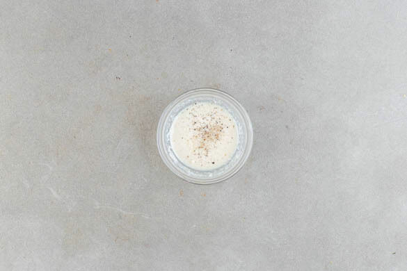 Den Käse fein reiben. Den Knoblauch schälen, halbieren und die ½ des Knoblauchs oder mehr nach Geschmack durch eine Knoblauchpresse drücken. Den Käse und den Knoblauch mit 2EL Mayonnaise, 1EL Wasser und 1TL Essig verrühren. Die Käsecreme mit Salz und Pfeffer abschmecken.