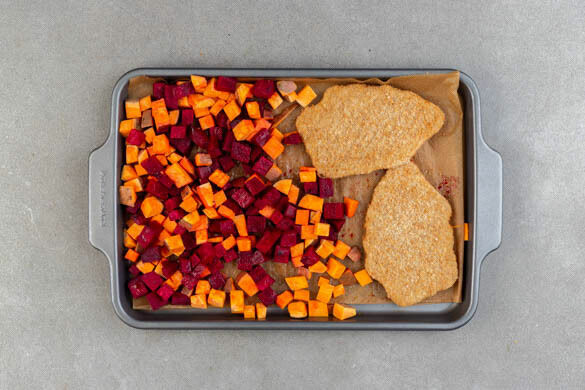 Das Gemüse auf einem mit Backpapier ausgelegten Backblech mit 1EL Olivenöl und je ½TL Salz und Pfeffer vermengen und 25–30Min. im Ofen backen, bis die Süßkartoffeln weich und die Rote-Bete-Würfel bissfest sind.