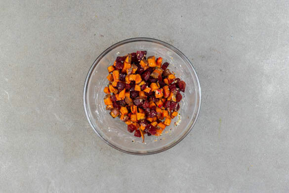Das Gemüse auf einem mit Backpapier ausgelegten Backblech mit 2EL Olivenöl und je 1TL Salz und Pfeffer vermengen und 25–30Min. im Ofen backen, bis die Süßkartoffeln weich und die Rote-Bete-Würfel bissfest sind.