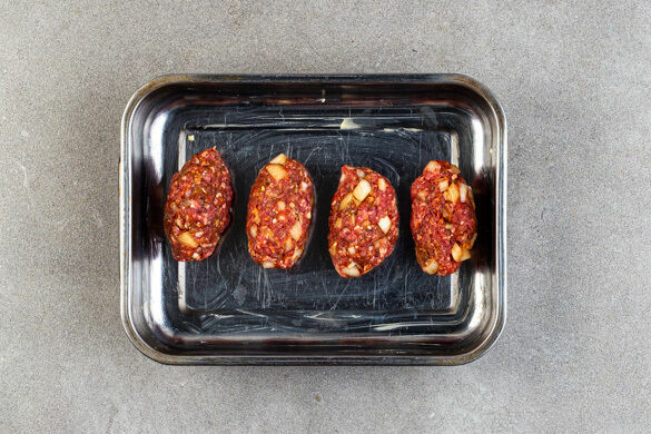 Das Hackfleisch mit leicht angefeuchteten Händen zu 8 gleich großen Bällchen rollen und diese zu ca. 2cm breiten und 5cm langen Kofta formen. Die Kofta in die Auflaufform geben und im Ofen ca. 8Min. backen, dann herausnehmen.