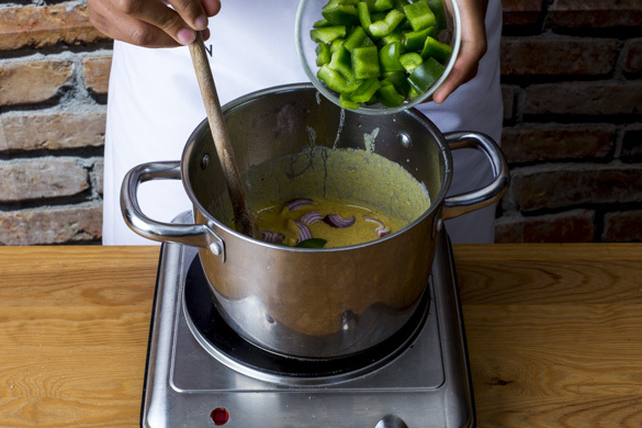 Die Paprika und die Zwiebeln unter die Korma-Sauce mischen und die Sauce mit Salz abschmecken.