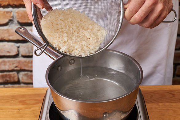 In einem mittelgroßen Topf 800ml leicht gesalzenes Wasser zum Kochen bringen. Den Reis in einem Sieb unter fließendem Wasser abspülen, bis das Wasser klar bleibt. Sobald das Wasser kocht, den Reis bei niedrigster Hitze abgedeckt ca. 10–12Min. kochen, bis das Wasser aufgesogen und der Reis gar ist. Noch ca. 5Min. ohne Hitzezufuhr abgedeckt ziehen lassen.