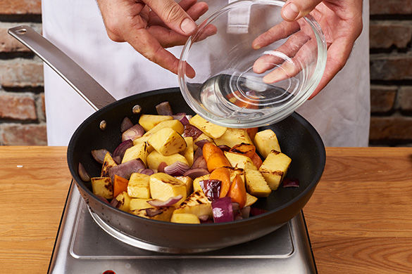 Die Karotten und die Steckrüben schälen und in 1–2cm große Stücke schneiden. Die Zwiebeln schälen, halbieren und grob würfeln. Das Gemüse mit etwas Salz und Zucker vermengen und beiseitestellen.