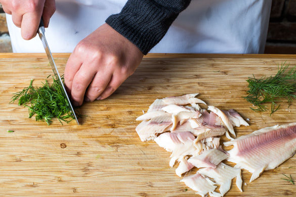 Die Forellenfilets in mundgerechte Stücke schneiden und mit etwas Pfeffer würzen. Den Dill fein hacken, einige Dillspitzen als Garnitur beiseitelegen.