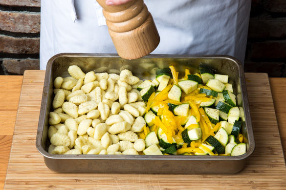 Die Zucchini, die Paprika und die Gnocchi in eine große Auflaufform geben. Mit 1–2EL Olivenöl, Salz und Pfeffer vermengen und im Ofen ca. 15–20Min. goldbraun backen.