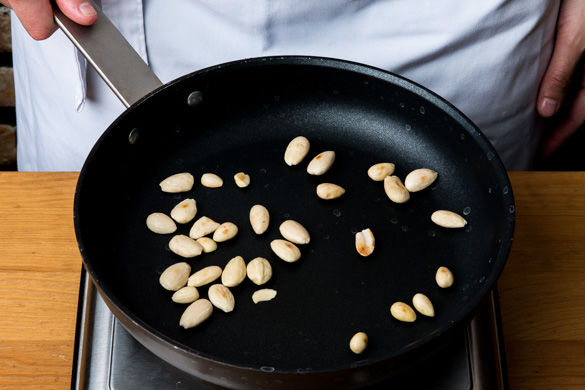Die Mandeln in einer kleinen Pfanne ohne Zugabe von Fett bei mittlerer Hitze unter Rühren 3–5Min. leicht anrösten. Vorsicht, die Mandeln können leicht verbrennen.