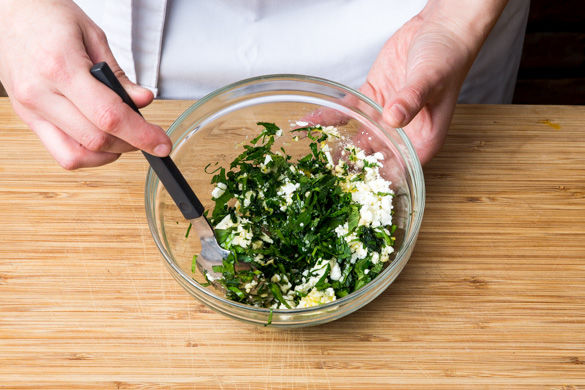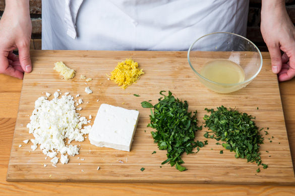 Den Knoblauch schälen und sehr fein hacken oder pressen. Die Zitronenschale abreiben, dann die Zitrone halbieren und auspressen. 1/3 des Fetas fein zerkrümeln. Die Minze- und die Petersilienblätter von den Stängeln zupfen und fein hacken.