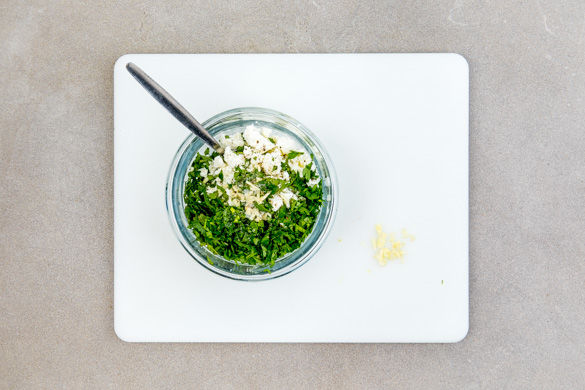 Den Knoblauch schälen und fein hacken. Den Feta mit den Fingern oder einer Gabel zerkrümeln und mit den Kräutern und der 1/2 des Knoblauchs vermengen. Die Käse-Kräuter-Mischung mit Salz und Pfeffer würzen.