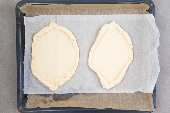 Den Pizzateig auf einem Backblech ausrollen, quer halbieren und die 2 Rechtecke jeweils zu einem Schiffchen formen. Dafür die langen Ränder leicht einrollen, die Ecken umschlagen und an den Stirnseiten jeweils eine Spitze formen.