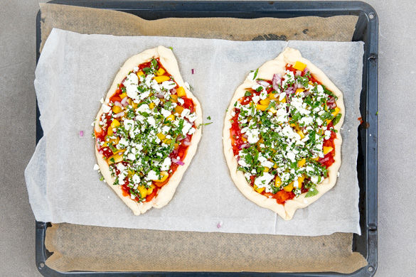 Die Pide-Schiffchen innen mit der Tomatensauce bestreichen, die Zwiebeln und die Paprika gleichmäßig darauf verteilen und die Käse-Kräuter-Mischung darübergeben. Mit 1–2TL Olivenöl besprenkeln und die Pide im Ofen ca. 20–30Min backen, bis die Ränder goldbraun sind.