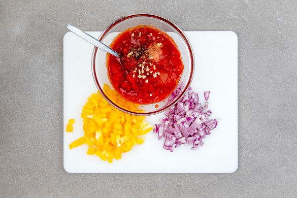 Die Zwiebeln schälen und in ca. 0,5cm kleine Würfel schneiden. Die Paprika halbieren, entkernen und in 1cm große Würfel schneiden. Die gehackten Tomaten mit dem restlichen Knoblauch verrühren und mit 1 Prise Zucker, Salz und Pfeffer würzen.