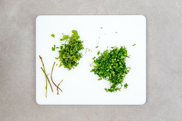 Den Backofen auf 200°C Umluft (220°C Ober-/Unterhitze) vorheizen. Die Minzeblätter von den Stängeln zupfen. Die Minzeblätter und die Petersilie samt Stängeln fein hacken.