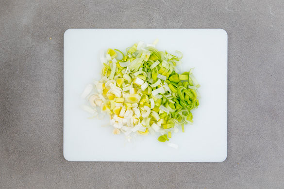 Den Lauch der Länge nach einschneiden und unter fließendem Wasser auffächern, sodass alle Schichten gesäubert werden. Gut abtropfen lassen und in dünne Streifen schneiden. In einem mittelgroßen Topf ausreichend leicht gesalzenes Wasser für die Pasta zum Kochen bringen.