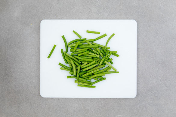 Die Enden der Bohnen abschneiden und die Bohnen quer halbieren. In einem mittelgroßen Topf ausreichend leicht gesalzenes Wasser zum Kochen bringen, die Bohnen hineingeben und für ca. 5–8Min. bissfest kochen. In ein Sieb abgießen, kurz mit kaltem Wasser abschrecken und abtropfen lassen.