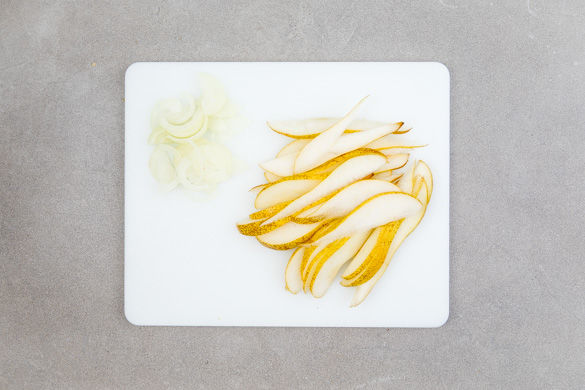 Die Birnen vierteln, entkernen und in lange, dünne Streifen schneiden. Die Zwiebeln schälen, halbieren und in dünne Streifen schneiden.