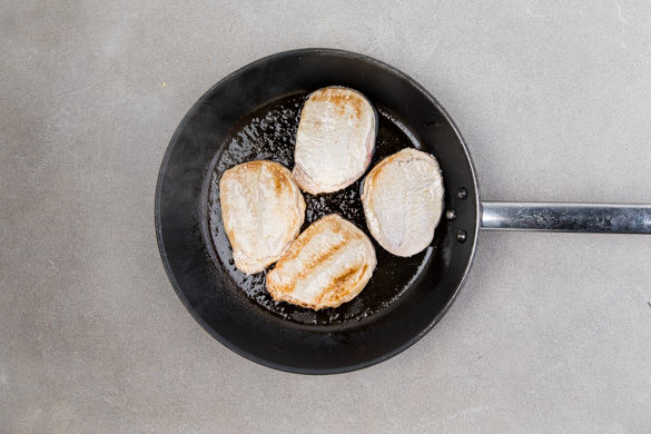 Die Petersilienblätter abzupfen und fein hacken. Den Speck in einer mittelgroßen Pfanne bei mittlerer Hitze ca. 2–3Min. kross anbraten, aus der Pfanne nehmen und beiseitestellen.