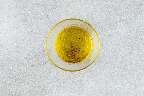 Aus je 2EL Olivenöl, Essig und Wasser ein Dressing anrühren und nach Geschmack mit Salz, Pfeffer und Zucker würzen. Tipp: Wer mag, kann statt Wasser auch Apfelsaft verwenden.
