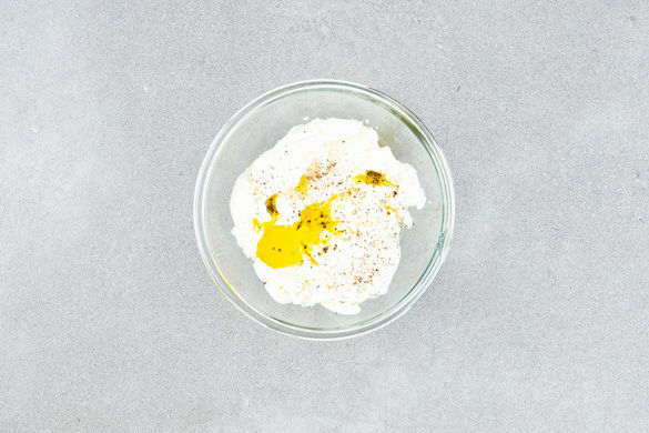 Die Crème fraîche mit 1EL Olivenöl glatt rühren und mit Salz und Pfeffer abschmecken.