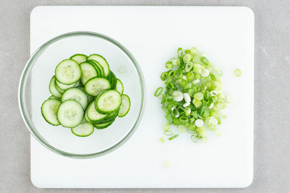 Die Limetten halbieren und auspressen. Die Gurke in dünne Scheiben schneiden und mit 1–2EL Limettensaft und 2 Prisen Salz vermengen. Die Lauchzwiebeln in dünne Ringe schneiden.