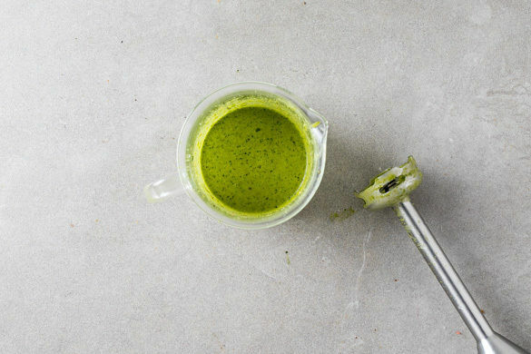 Den Knoblauch schälen und halbieren. Ca. 5 Basilikumblätter von den Stängeln zupfen, fein schneiden und beiseitelegen. Das restliche Basilikum samt Stängeln mit 4EL Olivenöl, 2EL Wasser und dem Knoblauch in einem hohen Gefäß pürieren. Mit Salz, Pfeffer und ggf. 1 Prise Zucker abschmecken.