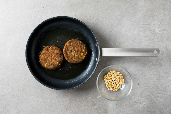 Die Pinienkerne in einer großen Pfanne ohne Zugabe von Fett bei mittlerer Hitze 1–2Min. goldbraun anrösten. Vorsicht, sie können schnell zu dunkel werden. Zum Abkühlen aus der Pfanne nehmen und beiseitestellen. Die Burgerpattys in derselben Pfanne mit 1TL Olivenöl bei mittlerer Hitze auf jeder Seite ca. 2Min. anbraten.