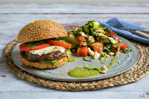Wer liebt sie nicht, die klassische Kombination aus frischer Tomate, aromatischem Basilikum und cremigem Mozzarella? Sie alle dürfen heute, ergänzt um Zucchini und Pinienkerne, den saftigen Burger begleiten. Das leckere Champignonpatty wird übrigens ganz ohne Zusatz von Aromen, Farbstoffen und Geschmacksverstärkern in den Niederlanden produziert und schmeckt einfach großartig!