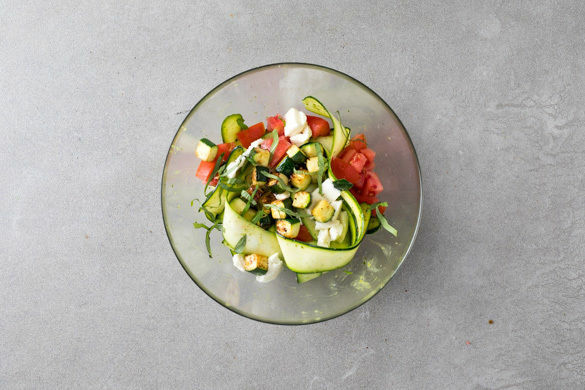 Die Zucchinistreifen mit dem geschnittenen Basilikum sowie den Tomaten-, Zucchini- und Mozzarellawürfeln, 2–3EL Kräuteröl und 1–2EL Essig vermengen. Mit Salz und Pfeffer abschmecken.