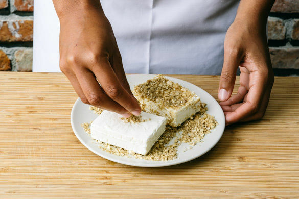 Den Feta halbieren und von allen Seiten in den gewürzten Haselnüssen wenden, dabei die Nüsse etwas andrücken, damit sie am Feta haften. Auf einem mit Backpapier ausgelegten Backblech 8–12Min. im Ofen rösten.