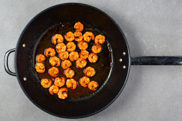 Inzwischen eine große Pfanne stark erhitzen. Die Garnelen mit 2EL Pflanzenöl in die heiße Pfanne geben und rundum ca. 3Min. anbraten, bis die Garnelen rosa sind. Die Pfanne vom Herd nehmen.