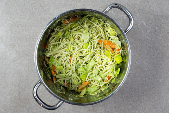 Die Nudeln und das Gemüse in einem Sieb abtropfen lassen, zurück in den Topf geben und mit dem Koriander-Kokos-Pesto vermengen, dabei ggf. 3–4EL Wasser zugeben. Mit Salz und Pfeffer abschmecken.