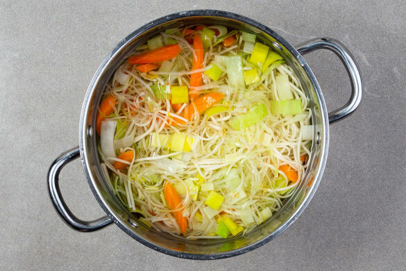 Die Nudeln und den Gemüsemix in das kochende Wasser geben und 4–6Min. köcheln lassen, dabei regelmäßig umrühren.
