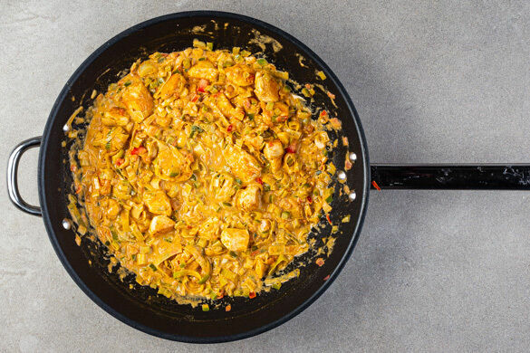Das Fleisch mit ⅔ der Crème fraîche und 80ml Wasser zurück in die Pfanne geben und alles bei mittlerer bis niedriger Hitze ca. 8Min. sanft köcheln lassen, bis das Fleisch gar und das Gemüse weich ist.