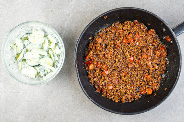 Das Hackfleisch mit Salz und Pfeffer abschmecken. Die Gurken mit dem Dressing vermengen.