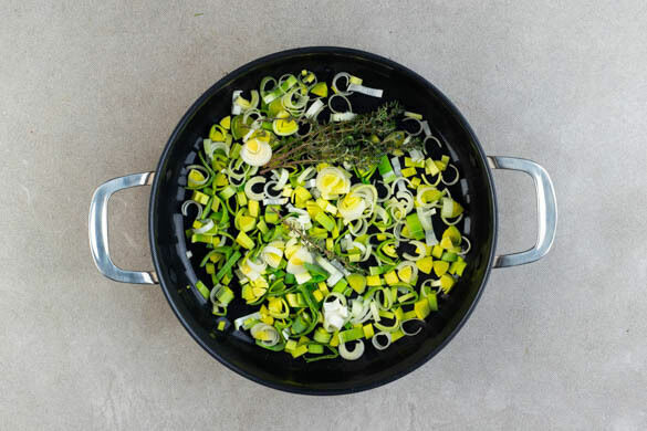 Das Brühgewürz in 1,8L heißem Wasser auflösen. 300ml Brühe abschöpfen und für die Sauce beiseitestellen, 1,5L Brühe werden für das Risotto benötigt. Den Lauch längs halbieren und quer in feine Streifen schneiden. Den Lauch und den Zitronenthymian in einem großen Topf mit 2EL Olivenöl bei starker Hitze 1–2Min. braten, bis der Lauch weich wird.
