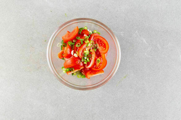 Die Tomaten in dünne Spalten schneiden, dabei den Strunk entfernen. 2EL Olivenöl mit 2EL Essig verrühren und das Dressing nach Belieben mit Salz und Pfeffer sowie etwas Honig oder 1 Prise Zucker abschmecken. Die Tomaten und die Lauchzwiebeln mit dem Dressing vermengen.