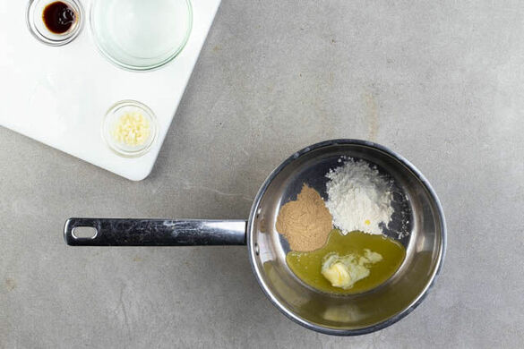 Den Knoblauch schälen und fein würfeln. Das Steinpilzpulver und ½EL Mehl in einem kleinen Topf mit ½EL Butter bei niedriger Hitze ca. 2Min. unter Rühren erwärmen. Den Knoblauch und 300ml heißes Wasser hinzufügen, kräftig mit Pfeffer würzen und aufkochen. Dann die Sauce bei niedriger Hitze 10–12Min. köcheln lassen, dabei gelegentlich umrühren.