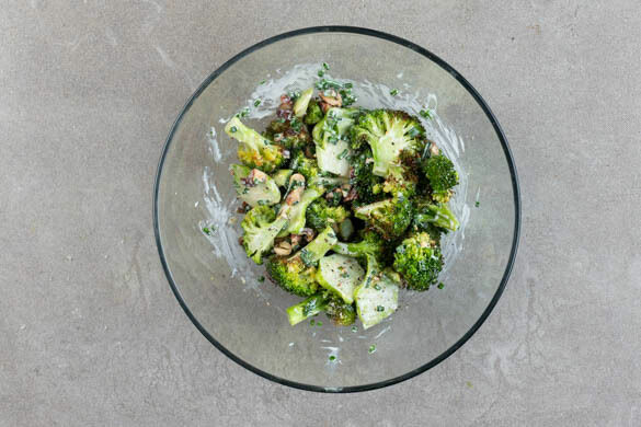 Die Mandeln grob hacken und mit dem gerösteten Brokkoli und den Datteln vermengen. Den Schnittlauch in kleine Röllchen schneiden. ¾ des Schnittlauchs und den restlichen Knoblauch mit 2EL veganer Mayonnaise und 4EL Wasser verrühren. Den Brokkoli-Salat mit dem Dressing vermengen und mit Salz und Pfeffer abschmecken.