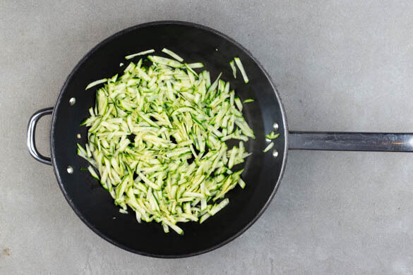 Den Knoblauch in einer zweiten Pfanne mit 2EL Olivenöl bei mittlerer Hitze in 30Sek.–1Min. leicht anbräunen. Die Zucchini zugeben und 2–3Min. mitbraten, bis sie weich wird.