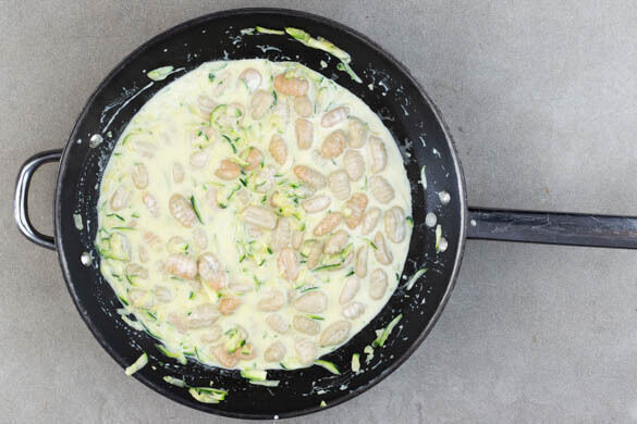 200ml heißes Wasser angießen, die Crème fraîche und das Brühgewürz unterrühren und die Sauce aufkochen lassen. Die Gnocchi hineingeben und alles 3–5Min. köcheln, bis die Gnocchi gar sind und die Sauce leicht eingedickt ist, ggf. mehr heißes Wasser zugeben.