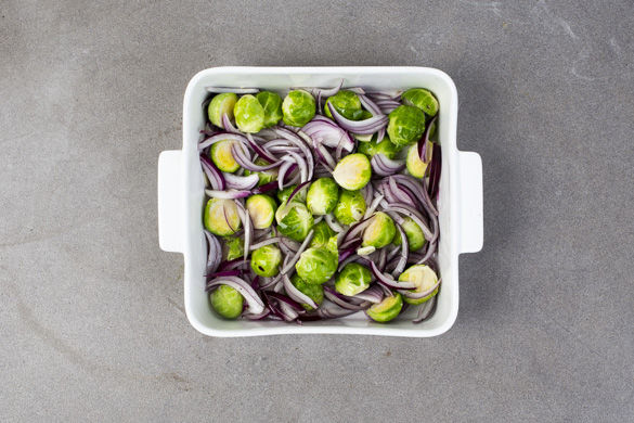 Ggf. die äußeren Blätter des Rosenkohls entfernen. Die Rosenkohlröschen halbieren, größere vierteln. Die Zwiebel schälen und in feine Streifen schneiden. Den Knoblauch schälen und in feine Scheibchen schneiden. Das Gemüse mit 2EL Olivenöl, Salz und Pfeffer vermengen, in eine Auflaufform geben und im Ofen ca. 20–25Min. backen, bis der Rosenkohl gar ist.