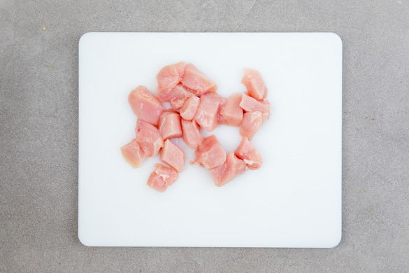 Das Fleisch mit etwas Küchenkrepp trocken tupfen und in 2–3cm große Stücke schneiden.
