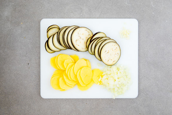 Den Backofen auf 220°C Umluft (240°C Ober-/Unterhitze) vorheizen. Die Kartoffeln schälen und in sehr dünne Scheiben schneiden oder hobeln. Die Zwiebel schälen und in feine Würfel schneiden. Den Knoblauch schälen und fein hacken. Die Aubergine in möglichst dünne Scheiben schneiden und leicht salzen.