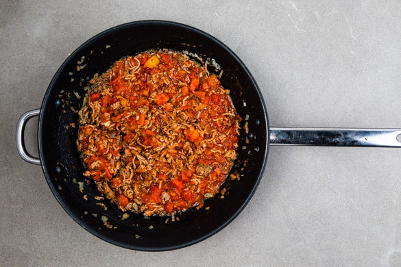 Das Fleisch in einer mittelgroßen Pfanne mit 1EL Olivenöl bei starker Hitze ca. 3–5Min. anbraten. Die Zwiebeln und den Knoblauch hinzugeben und weitere 1–2Min. braten. Mit den gehackten Tomaten ablöschen. Nach Geschmack mit Oregano, Salz und Pfeffer würzen und bei niedriger Hitze ca. 5Min. leicht köcheln lassen.