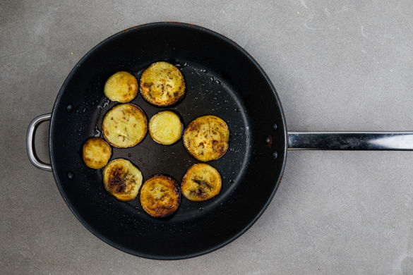Die Auberginenscheiben mit etwas Küchenkrepp trocken tupfen und in einer großen Pfanne mit 1–2EL Öl bei starker Hitze von beiden Seiten 1–2Min. scharf anbraten. Überschüssiges Fett auf etwas Küchenkrepp abtropfen lassen und die Auberginenscheiben beiseitestellen.